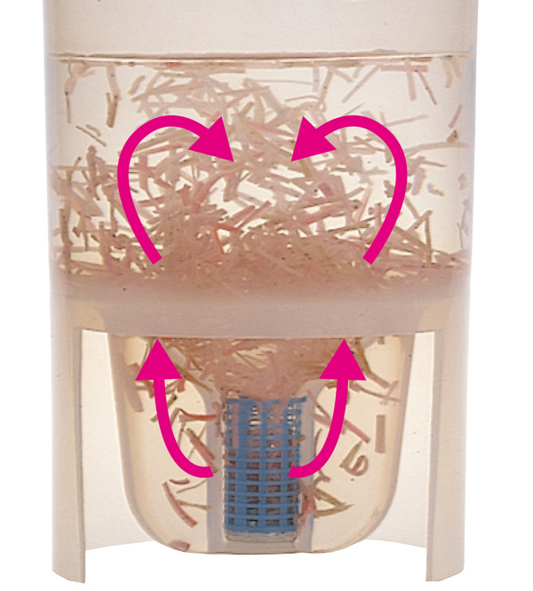 Mixing opossum shrimp and seawater in a bucket, and making them into a completely wet bait. The basket that is shaken two to three times plays a role of a piston and a pump, and the shrimp will rise from the bottom of the three-direction groove and enter the basket to the last without wasting.