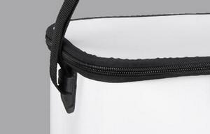 This surf-use bait bucket features a rounded bottom and a large zipper for improved usability.