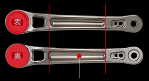 The handle plate is made of "A7075 super duralumin," a material that requires strength while being cautious. A block of A7075 super duralumin is precision machined with 3D cutting. The hollowed-out shape is inspired by one of the most harshly used engine components, the "connecting rod." It withstands complex forces such as compression, tension, and bending. The result is a plate with extremely high strength.