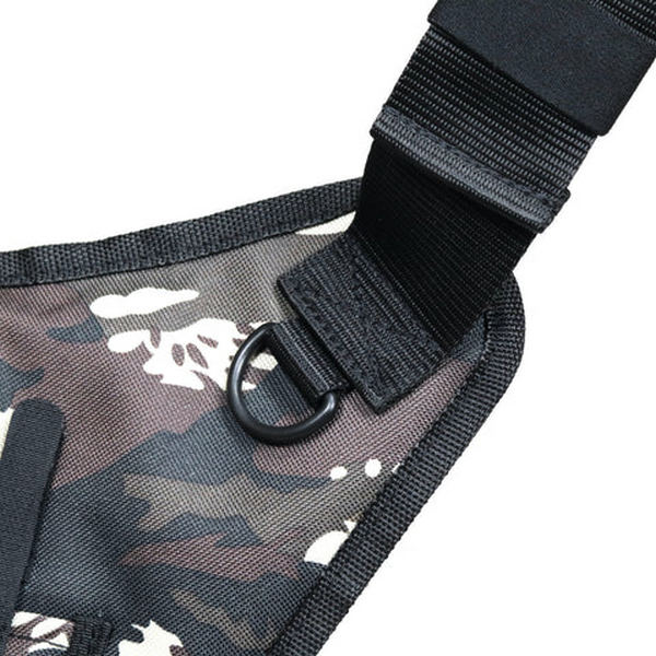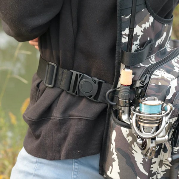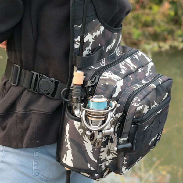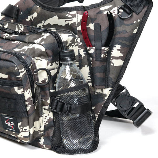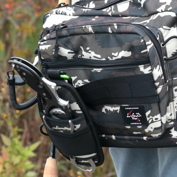 Optional parts such as a pliers holder and sunglasses pouch can be attached to the custom base on the front of the bag.