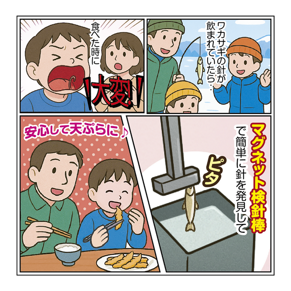 A hook detection stick that can be used to determine whether a smelt has swallowed a hook. A powerful neodymium magnet is also attached to the spines inside the smelt's body, making it easy to identify which smelt have swallowed the spines. The 5 cm wide neodymium magnet easily switches between vertical and horizontal positions thanks to its magnetic strength. Use it vertically for pinpoint detection or horizontally for detection over a large area. The EVA handle extends and serves as a protective cover for the neodymium magnet when not in use, preventing false activation. A convenient item that will allow you to rest peacefully after fishing.