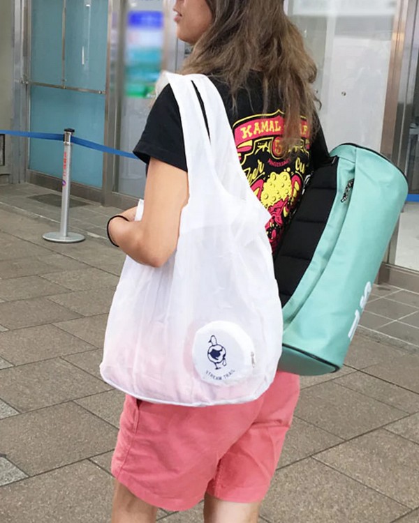 The round cover has the ST logo on the front when folded and stored, and becomes a pocket with a Wetty design when unfolded and used as a bag. Comes with a carabiner so you can attach it to the D pipe of your bag. Comes in handy on the go as a sub bag or eco bag.