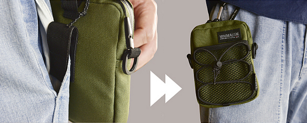 Attach the carabiner on top to your belt loop and the magnetic hook on the back to your pocket to prevent the bag from flapping around when you move.