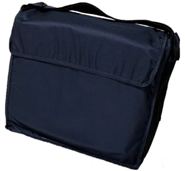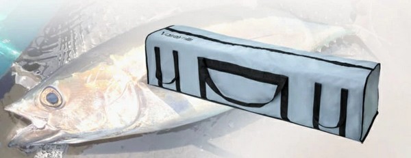 A simple insulated bag for large catches. This simple insulated bag is designed for storing large fish like tuna. The exterior is made of durable tarpaulin, with cushioning in the middle and an aluminum sheet inside to reflect cold air. It features handles in the center and on both ends for easy carrying by multiple people. When not in use, it can be folded and stored in the included storage bag.