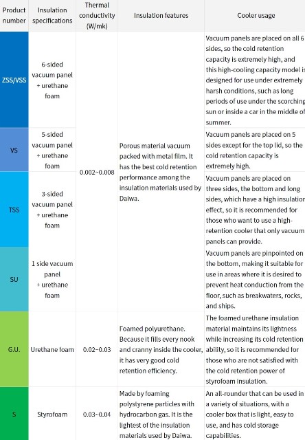 Daiwa propose 3 types de matériaux isolants et 6 types de structures d’isolation pour vous permettre de choisir la glacière la mieux adaptée à vos besoins.