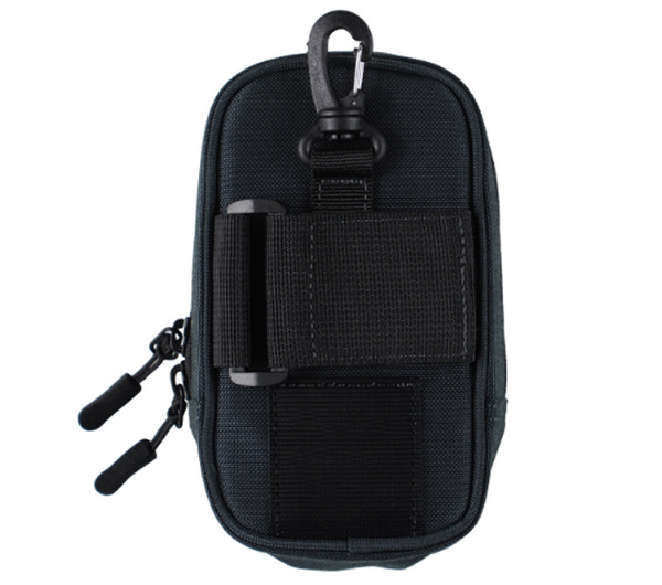 The back has a carabiner, a tape belt with adjustable length, and hook-and-loop fasteners (male), so you can attach it to a vest or other items in a variety of ways.