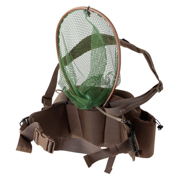 - Rain gear can be attached to the lower straps, and a landing net can be inserted into the center of the waist belt.