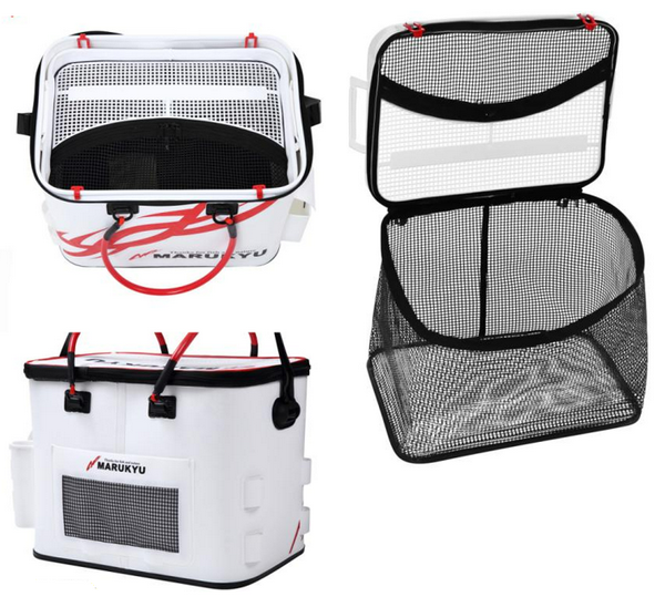 The removable inner mesh basket allows for quick fish removal. The Maruki Yurogo logo is printed on the underside of the top lid, allowing for use even with the lid open without compromising the appearance. A pocket for two air pumps and a rod holder for temporarily holding fishing rods and fishing tackle are standard equipment. The Maruki Yurogo custom belt allows for additional functionality by attaching separately sold rod stands and side pouches. The waterproof shoulder strap prevents stains and odors, ensuring hygiene.