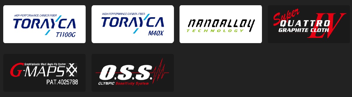 Blank Material & Technology The blanks combine multiple materials—including Torayca® T1100G, Torayca® M40X (models 572XUL-S and 582SUL-T use T1100G only), and low-elasticity carbon—to balance stiffness and flexibility as needed. The butt section is reinforced with Super Quattro Graphite Cloth LV and the G-MAPS manufacturing process (PAT.), minimizing power loss while maintaining strong lifting capability.