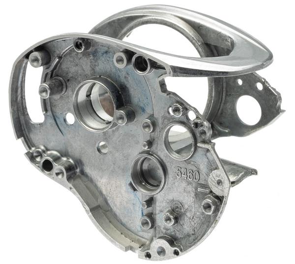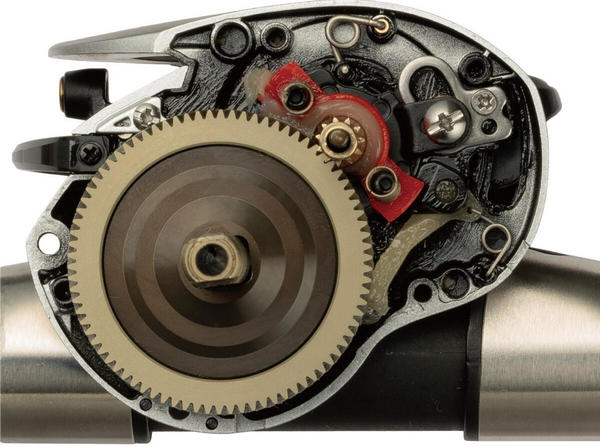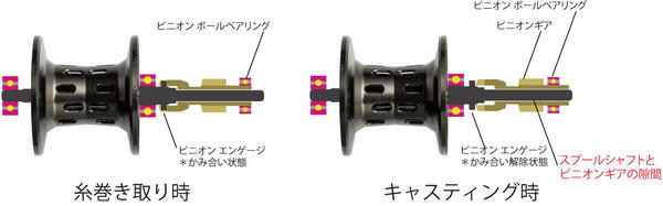 The powerful reeling force from the handle is transmitted in the order drive gear → pinion gear → spool. Even the slightest distortion in any part of this rotation transmission will have a negative effect on rotation. The pinion support structure securely supports the outer part of the pinion gear with the crank side plate via a ball bearing. This structure achieves highly efficient reeling and a greatly improved gear feel. Furthermore, when casting, optimal spool free movement and castability are achieved by maintaining a constant appropriate clearance between the inner surface of the pinion gear and the rotating spool shaft.