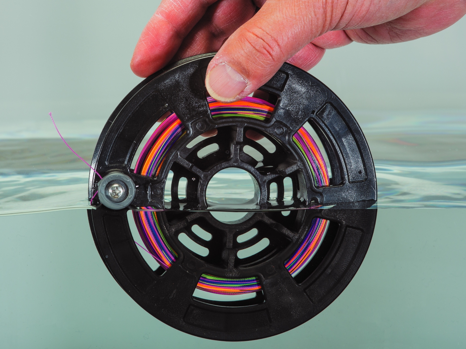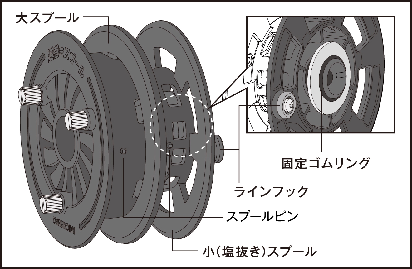 ● 염분 제거 구멍이 있는 작은 스풀에 라인을 감고, 작은 스풀 전체를 따뜻한 물에 담가 낚시줄의 염분을 제거할 수 있습니다.