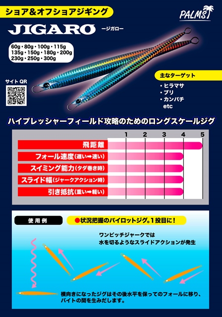 When worked diagonally with short, low-power inputs, it delivers high turning performance and a refined swimming action. Even when controlling the initial speed of the jig, it retains its inherent potential to bring out the intended movement. Packed with features to conquer heavily pressured fishing grounds, the Jigaro is a precision tool for serious jigging.
