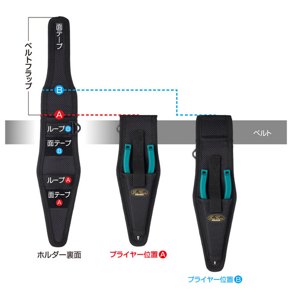 The storage compartment is designed three-dimensionally to make it easy to insert and remove pliers. It also comes with a fixing belt with hook-and-loop tape to securely hold the pliers in place.