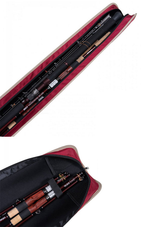 This case can store rods up to 130cm in length when collapsed. It's lighter than a hard case and stronger than a soft case, making it ideal for home storage or transport in a car. The D-rings on both ends allow you to attach a shoulder strap for convenient carrying during fishing trips. It has four internal pockets for storing small items such as hooks and snaps. It can comfortably store five of our long rods (such as the MARINO 10.6MH or VAJRADANA 11H).