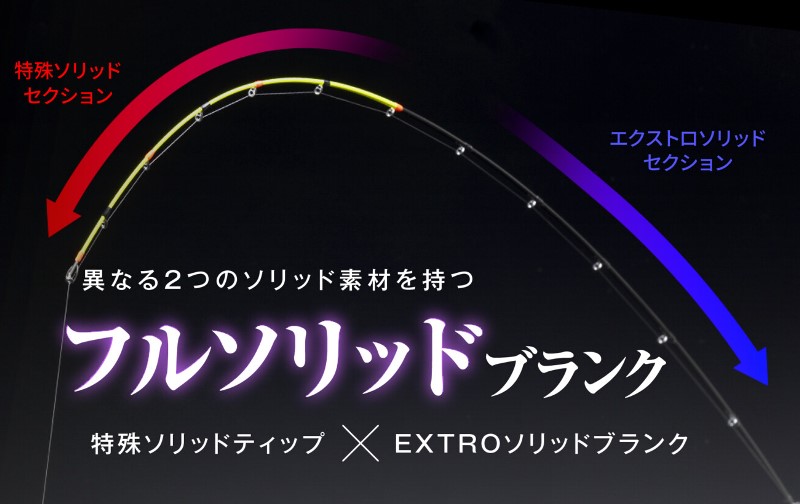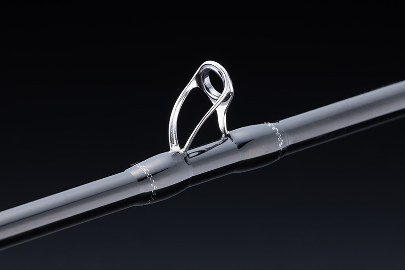 The carbon full-solid blank uses the “EXTRO structure,” a manufacturing method that combines flexibility with rigidity—providing a soft, smooth bend when needed, yet delivering dependable strength and power under load. The tip section is seamlessly integrated with the ultra-flexible special solid tip shared across the Gekidaki Shaft series, allowing subtle bites to be clearly visualized. This structure also offers excellent durability, helping prevent breakage caused by line wrapping or excessive load during retrieval.