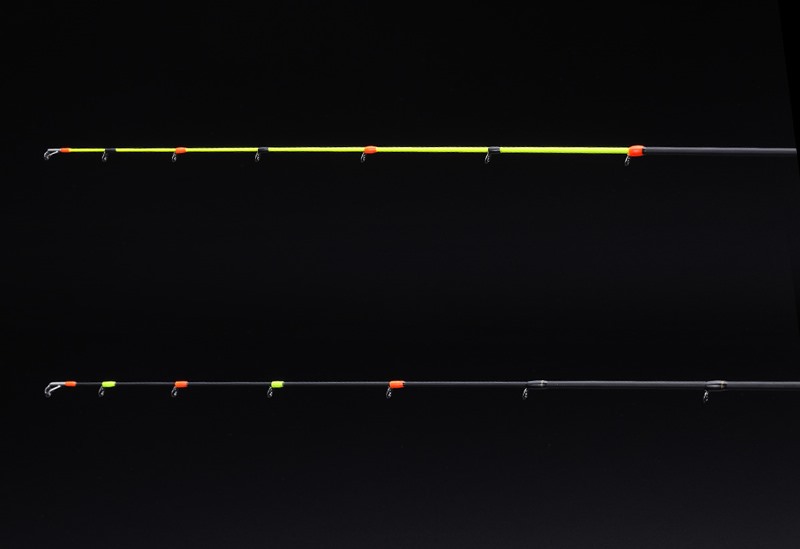 For rods held tip-up while waiting for bites: yellow blank with black & orange wraps.