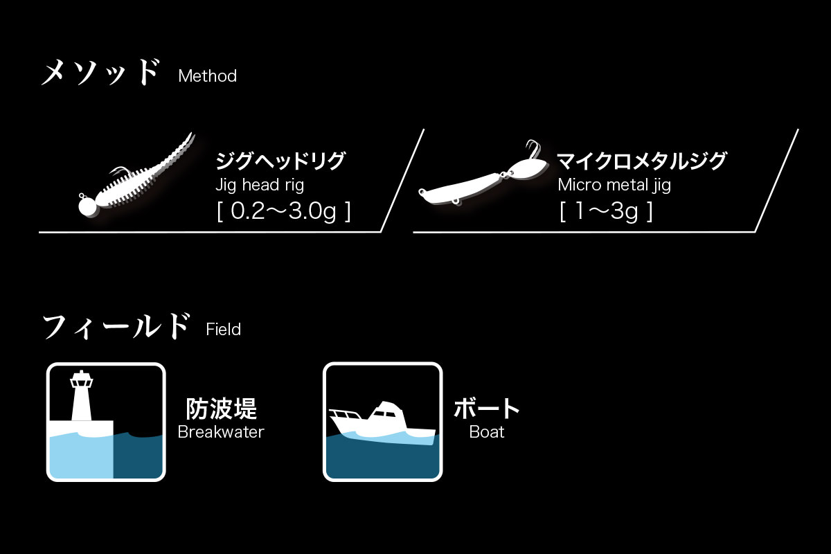 This multipurpose, high-performance rod has a rare ability to cover the widest possible range of situations. The unique tip portion is perfectly formed to produce just the right tension for fishing from levees and boats. This enables swift assessment of sea bottom topography and greatly minimizes snags, the sworn enemy of anglers chasing rockfish. Speedy blank recovery, driven by the strong tension of the rod, combine with rapid power hooking to deliver a real advantage in a variety of angling situations. The superior tip-up balancing feels like an extension of the arm, enabling swift rod work with Texas rigs and jig baits. The “direct connectivity” gives lure manipulation a feel of linearity, clueing you in on subtle bites and changes in topography.
