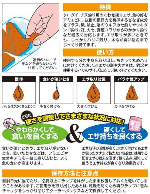 Замешанная приманка, содержащая "ингредиенты куколок", которые демонстрируют выдающуюся кормовую силу, и "Ами креветку", которую любят рыбы. Скальные берега, причалы и береговая рыбалка для укфукасе и укданго рыбалки. Мы можем справиться с широким диапазоном рыбалки с плотов, мотков и выращенного Ковари. Даже когда много приманки, она остается твердой, и вы можете ждать, пока не клюнет любимая рыба.
