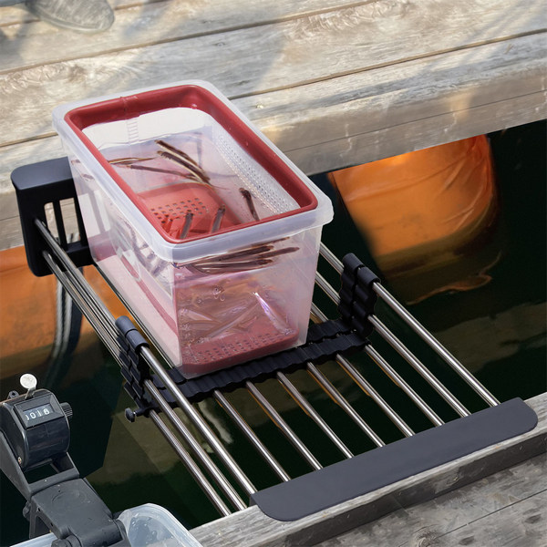 A rack for smelt tanks that can be set on a dome boat. Since it is extendable, it can be set on the edge of a dome ship or dome pier. If you place a smelt tank on it, your fishing spot will be neat and tidy, and you will be able to fish more quickly. Two unlocking cable ties are included to securely attach the device and prevent accidental falls into the water.