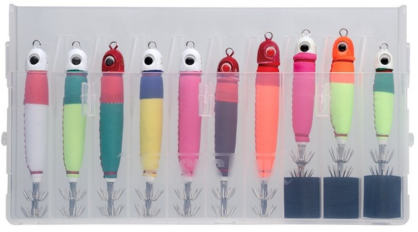 The included cylindrical EVA foam jigs, shown in the three on the far right, are height-adjustable for easier access to short squid jigs. Use them as needed.