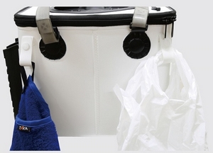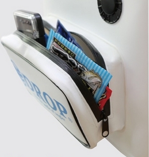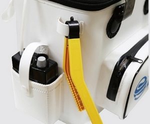The side features a loop for hanging a pump holder and fish lures.