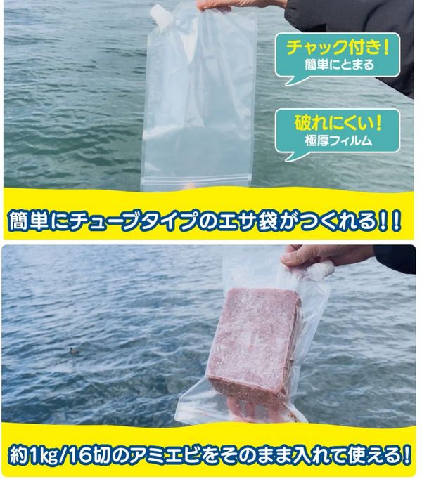 Transfer frozen shrimp into bags at home and head straight to the fishing spot! Easily make tube-type bait bags for mysid shrimp with these "Dirt-Free Raw Shrimp Tube Bags"! Pack 8 frozen shrimp blocks (approx. 1kg) straight away!