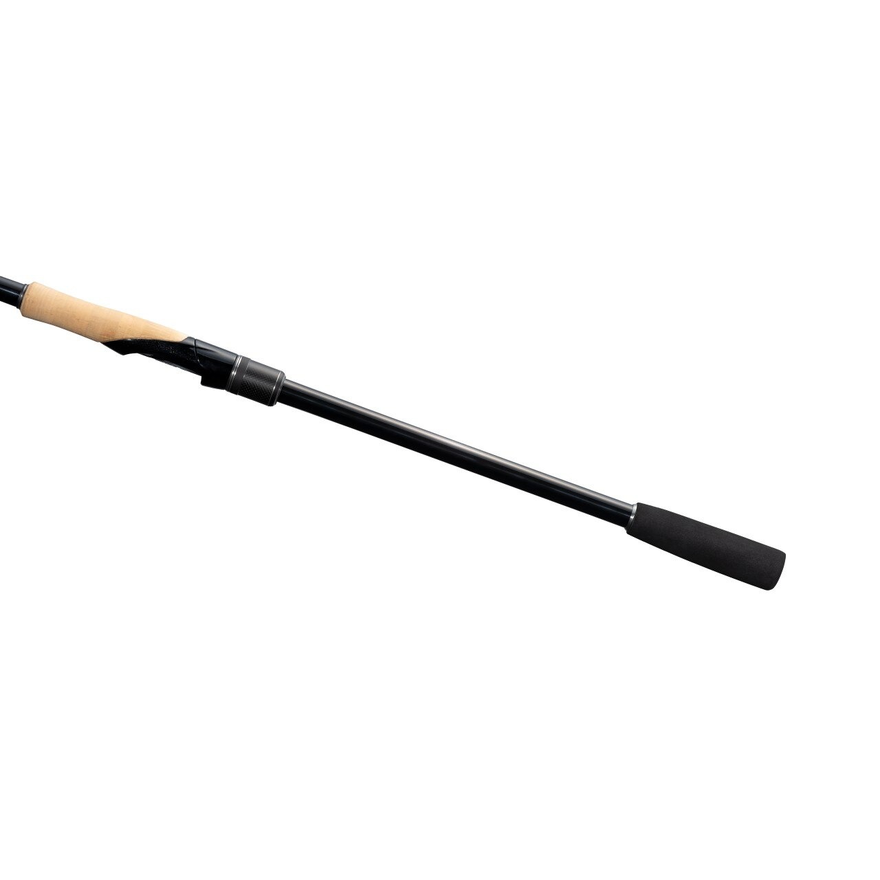 Reel seat length optimized for underarm fighting techniques and jig control.