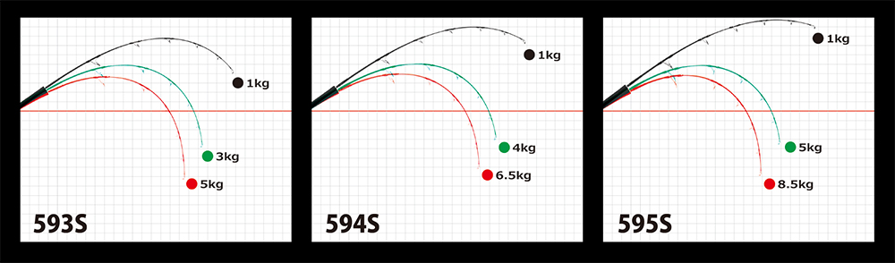 1公斤负载的图像显示了您抽动铁板时的弯曲曲线。其他图像则显示了最大药物重量和它们之间的重量。在与鱼搏斗时,杆子被保持在您应该保持的角度。