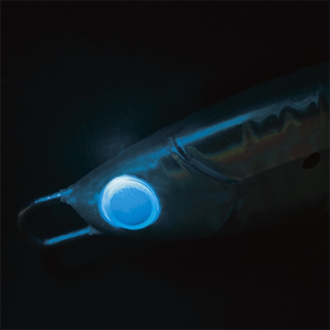 UV-reactive eyes attract predatory fish under sunlight and underwater UV light conditions.