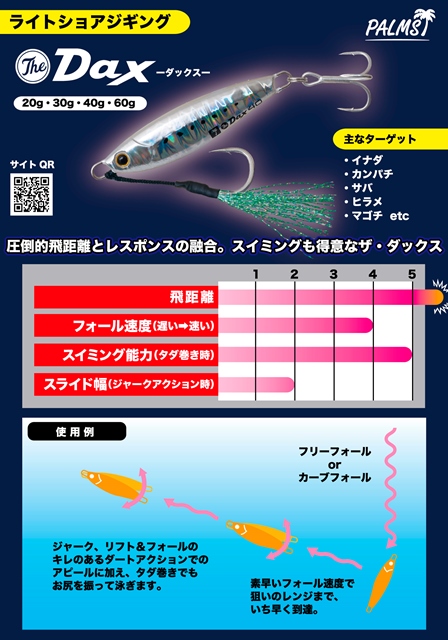 The sharply designed face, tail, and side edges enhance both flashing appeal and aerodynamic stability in flight. Combining excellent tide-handling capability with a high sink rate, The Dax is engineered for superior usability in light shore jigging situations.